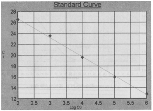 ABI公司首先根據(jù)上述原理研制了ABI 7700 等系列定量PCR儀,在PCR反應(yīng)中設(shè)置標(biāo)準(zhǔn)模板系列(一般5~7個標(biāo)準(zhǔn)濃度)反應(yīng)管和空白對照管。通過實時檢測反應(yīng)管中的熒光信號,計算出RQ+、RQ-、△RQ。RQ+代表樣品管熒光報告基團(tuán)發(fā)光強(qiáng)度與淬滅基團(tuán)發(fā)光強(qiáng)度的比率,RQ-代表空白管中二者的比率,△RQ(△RQ = RQ+-RQ-)代表PCR過程中熒光信號變化量。當(dāng)熒光信號增強(qiáng)到某一閾值(根據(jù)熒光信號基線的平均值和標(biāo)準(zhǔn)差,計算出以99.7%的置信度大于平均值作為閾值)時,標(biāo)準(zhǔn)模板反應(yīng)管所用的循環(huán)次數(shù)(Ct值)就被記錄下來。Ct值與標(biāo)準(zhǔn)模板數(shù)量的對數(shù)值之間有嚴(yán)格的線性關(guān)系[3],利用系列標(biāo)準(zhǔn)模板的Ct值,制成標(biāo)準(zhǔn)曲線(圖3),根據(jù)待測樣品的Ct值,就可在標(biāo)準(zhǔn)曲線中確定待測樣品起始的DNA數(shù)量。根據(jù)數(shù)據(jù)處理,即可得出定量結(jié)果。探針設(shè)計一般應(yīng)符合以下條件[2]:①探針長度應(yīng)在20~40個堿基左右,以保證結(jié)合的特異性。②GC堿基含量在40%~60%,避免單核苷酸序列的重復(fù)。③避免與引物發(fā)生雜交或重疊。④探針與模板結(jié)合的穩(wěn)定程度要大于引物與模板結(jié)合的穩(wěn)定程度,因此探針的Tm值要比引物的Tm值至少高出5℃。另外,探針的濃度,探針與模板序列的同源性,探針與引物的距離都對實驗結(jié)果有影響。