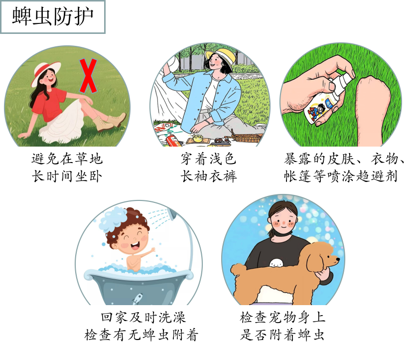 前預(yù)防:穿著緊口、淺色、光滑的長袖衣褲,不穿涼鞋,減少皮膚暴露;避免在草叢深處久坐;使用含避蚊胺、氯菊酯等成分的驅(qū)蟲劑噴灑腳踝、腰部等部位以及衣服和帳篷等露營裝備。