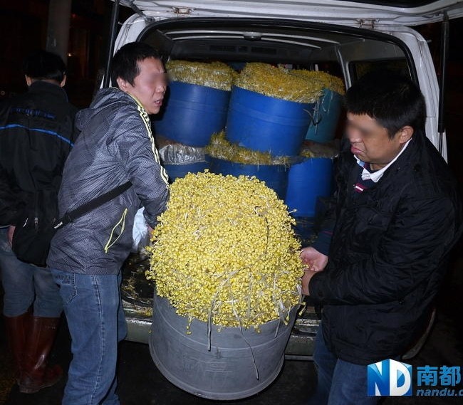 3月5日凌晨5時(shí)24分,海珠金溪農(nóng)貿(mào)市場(chǎng)門(mén)前,埋伏一夜的干警截獲一輛滿(mǎn)載上千公斤毒豆芽的面包車(chē)。南都記者 馬強(qiáng) 攝